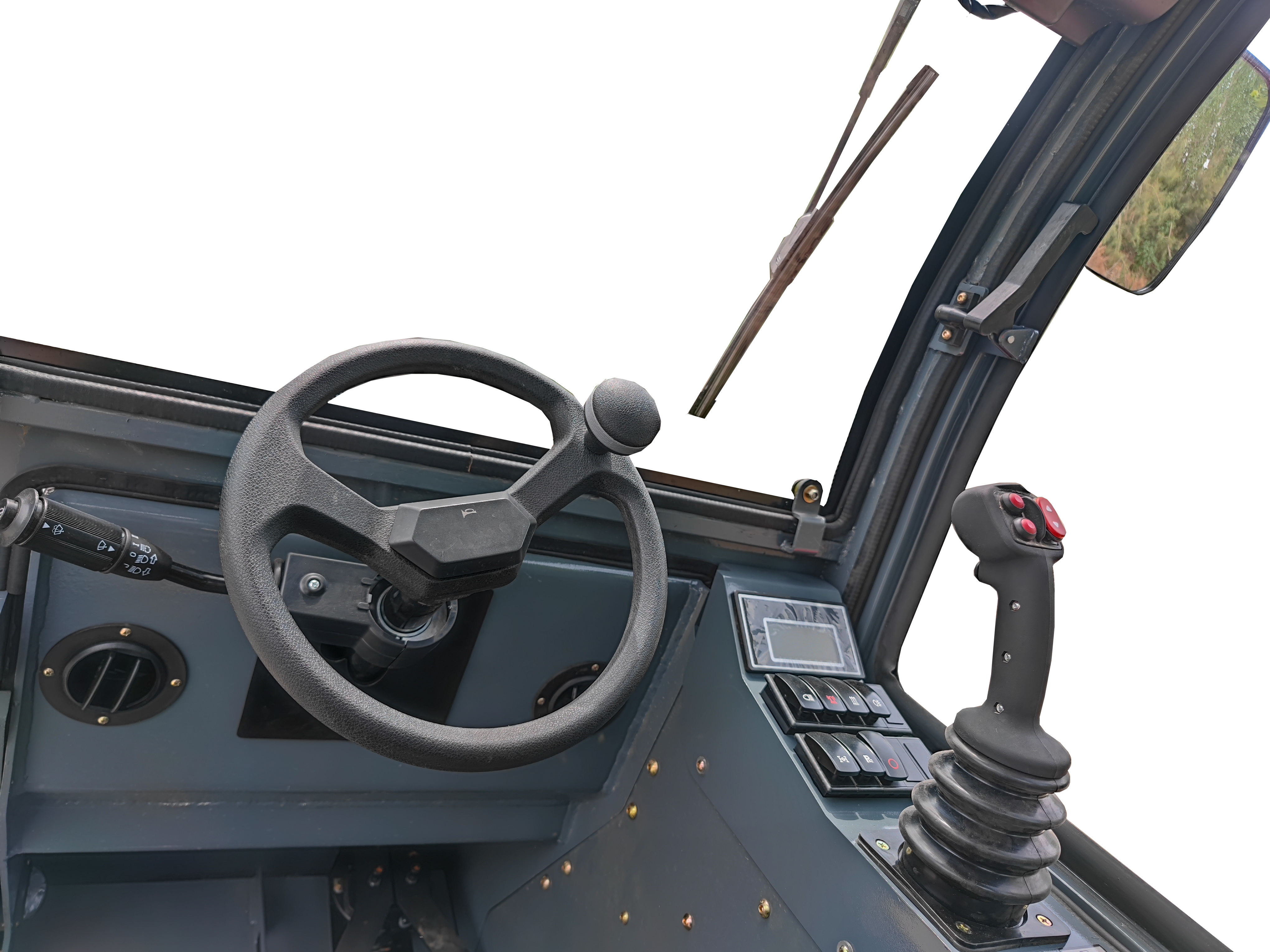 Управление при помощи рулевого колеса и джойстика более удобное и интуитивно понятное, позволяет вдвое снизить затраты на обучение операт